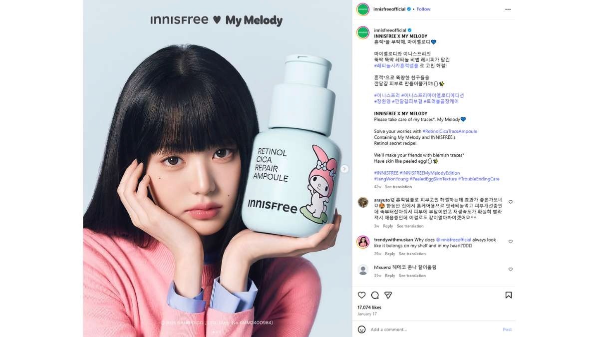 Innisfree also gained massive engagement through exciting brand collaborations. They teamed up with MyMelody, Disney, Looney Tunes, and even K-pop star Jang Wonyoung as the new brand ambassador. These collaborations added a fun, trendy touch to their brand image and kept followers excited for every new launch.